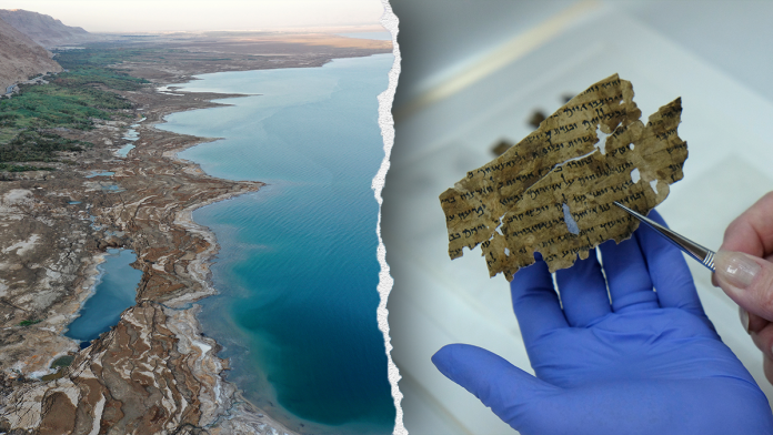 Split image of dead sea, scrolls