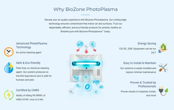 BioZone PhotoPlasmaâ„¢ air purification systems have also gained recognition from international authoritative organisations including HACCP Australia, SGS Fimko, Underwriters Laboratories, NSF, RoHS and are certified as Reach Compliant, attaining the ISO 14001 certification. Additionally, the Biozone Photoplasmaâ„¢ technology has also been independently tested by CNRS, The National Scientific Research Center of France, proving its efficacy against the H5 Avian flu virus, by eliminating 99.9998% of the virus in less than 0.44 seconds.