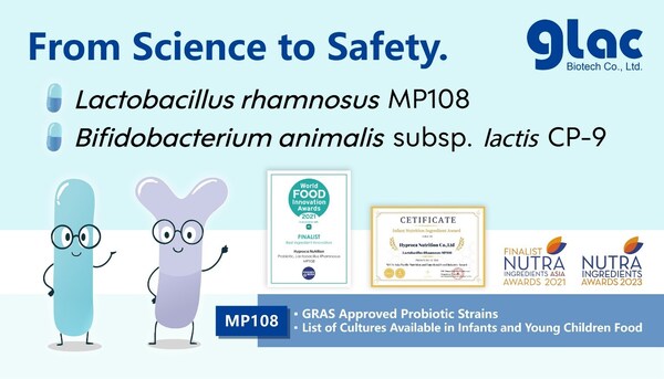 Glac Biotech’s first GRAS-notified strain, MP108, was shortlisted for the NutraIngredients Awards in 2021 and approved by the FDA in 2023. It was the first probiotic strain in Asia to be approved for infant use. Supported by clinical and safety data, MP108 is permitted for use at up to 10⁹ CFUs per serving in: