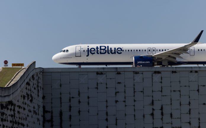 A JetBlue Airways plane prepares to take off from the Fort Lauderdale-Hollywood International Airport on January 31, 2024 in Fort Lauderdale, Florida.