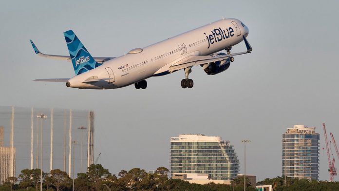 JetBlue Airlines Airbus A320 flies out of Reagan National Airport with the U.S. Capitol in the background